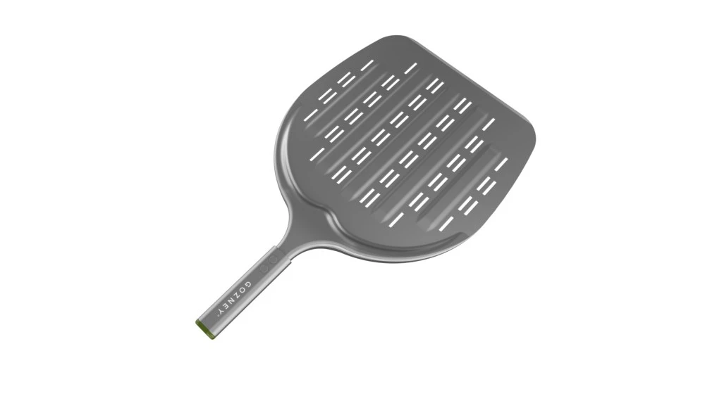 The placement peel is constructed from aluminium with a hard anodised finish. It is tapered on one edge to allow easy access beneath baked food or even pans. The peel features perforations to allow excess flour to fall away when making fresh pizza. Steam can also escape from the perforations giving the pizza a crispier base.